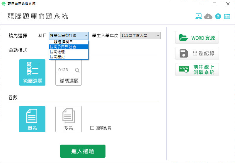 111學年下學期 技術高中命題光碟 龍騰版 社會科(地理、歷史、公民與社會科)(108課綱) 題庫光碟